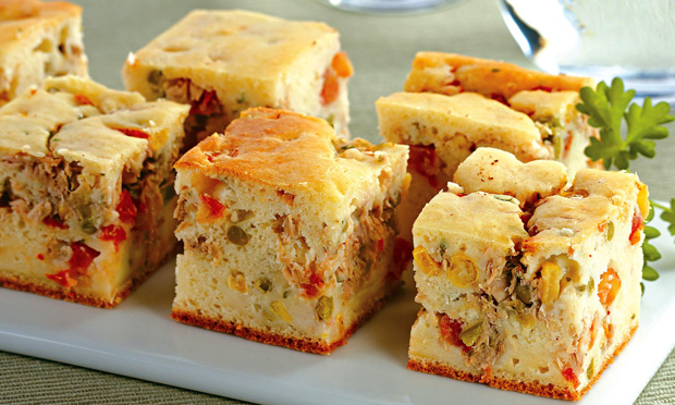 Comidas fáceis de comer e de servir como: salgadinhos, tortas, lanches rápidos.