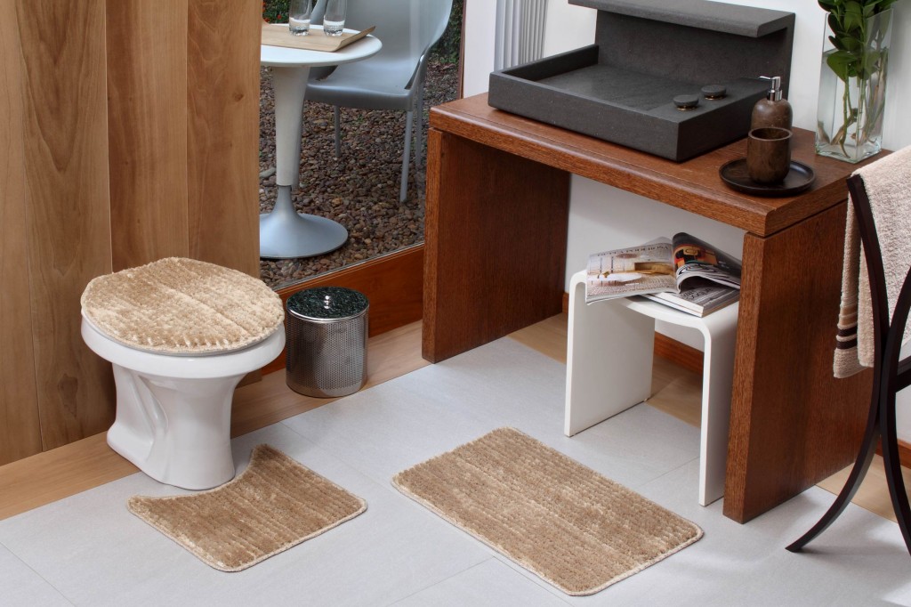 O jogo de tapete para banheiro contém três peças: Uma para o piso próximo ao lavatório, outra de piso com encaixe para o vaso e uma que forra a tampa.